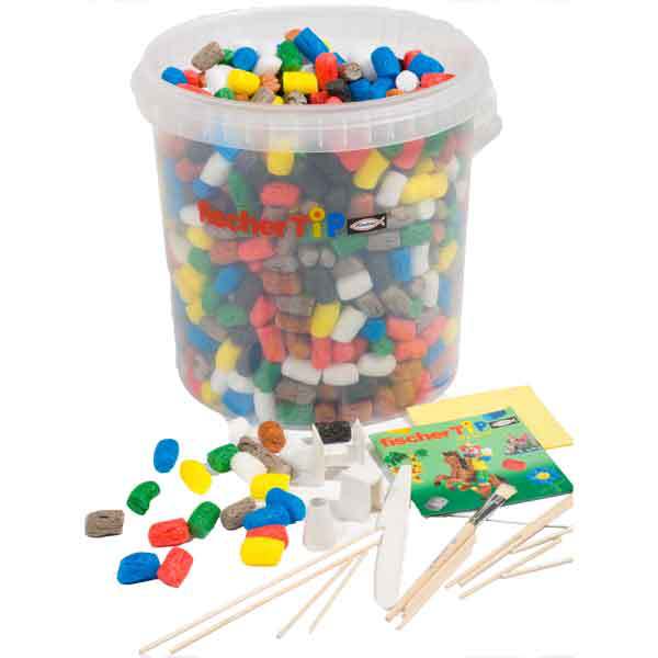 Ведро fischerTIP 1000 включает в себя 1000 разноцветных подушечек, специальную губку, пластмассовый ножик, кисточки и палочки, а также инструкции.