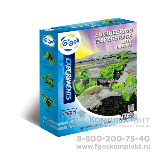 Конструктор Gigo Занимательная инженерия.Роботы– это набор из серии «Эксперименты», которая рассказывает ребенку об основах механики. Что могут модели -Пришельцы: они щелкают клешнями, вращают руками, с шипением скользят по направлению к вам и пытаются схватить своими цепкими щупальцами. Что же привело их в движение? Используйте знания о рычагах и работе мотора, который встроен в тела этих существ!