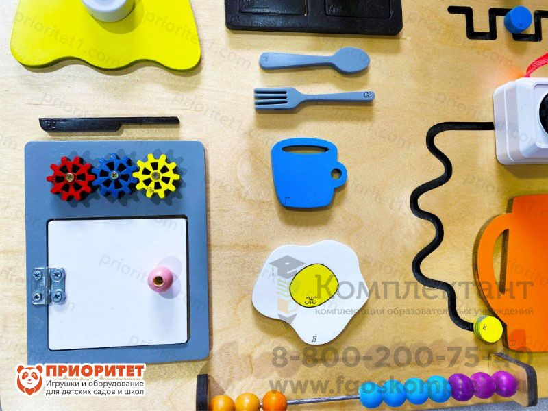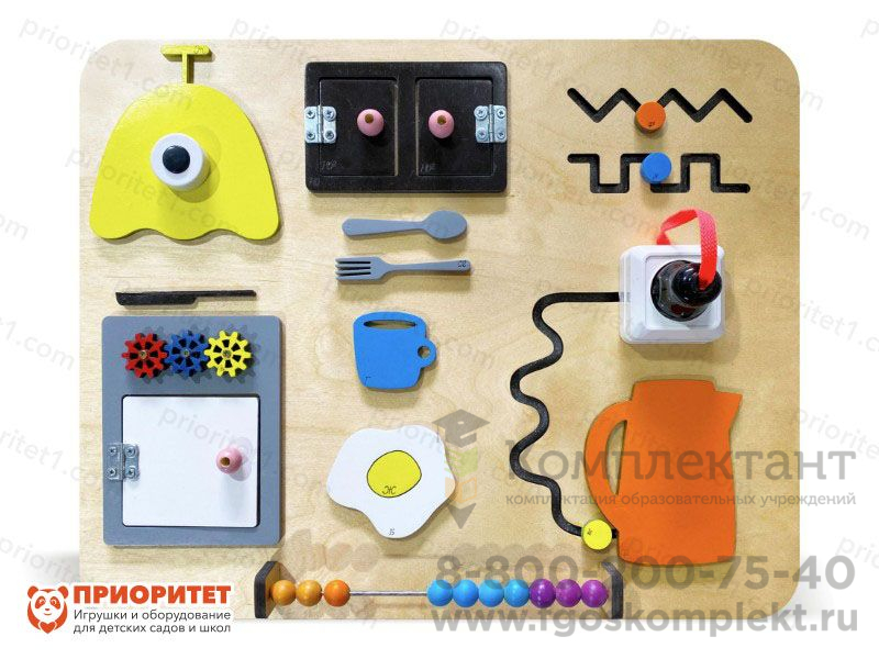 Ключевой темой бизиборда стала кухня. Панель напоминает собой небольшую комнатку уютного дома. Во время игры детям предстоит окунуться в мир домашних дел, семьи. Что интересного ждет малышей во время игры? Ребята узнают, какую мебель ставят на кухню, и испытают ее на прочность. Бизиборд богат разнообразием полезных элементов. Дети с легкостью придумают множество увлекательных сюжетов для игр с каждой деталью.