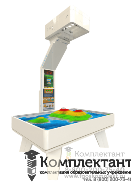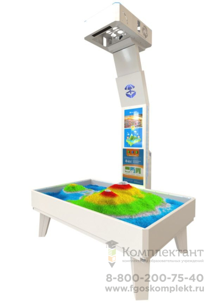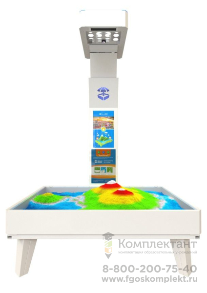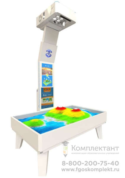 Комплект поставки: Проектор, Сенсор глубины, Компьютер, ОС: Windows, Wi-Fi модуль, Пакет из 26 базовых режимов, Резервуар песочницы, Планшет, Методическое пособие, Коробка с ключами и болтами, Техническая документация.