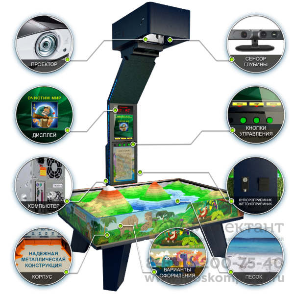 • Система двойного управления: кнопочная панель переключения игр на корпусе песочницы и планшетный ПК со специализированной программой