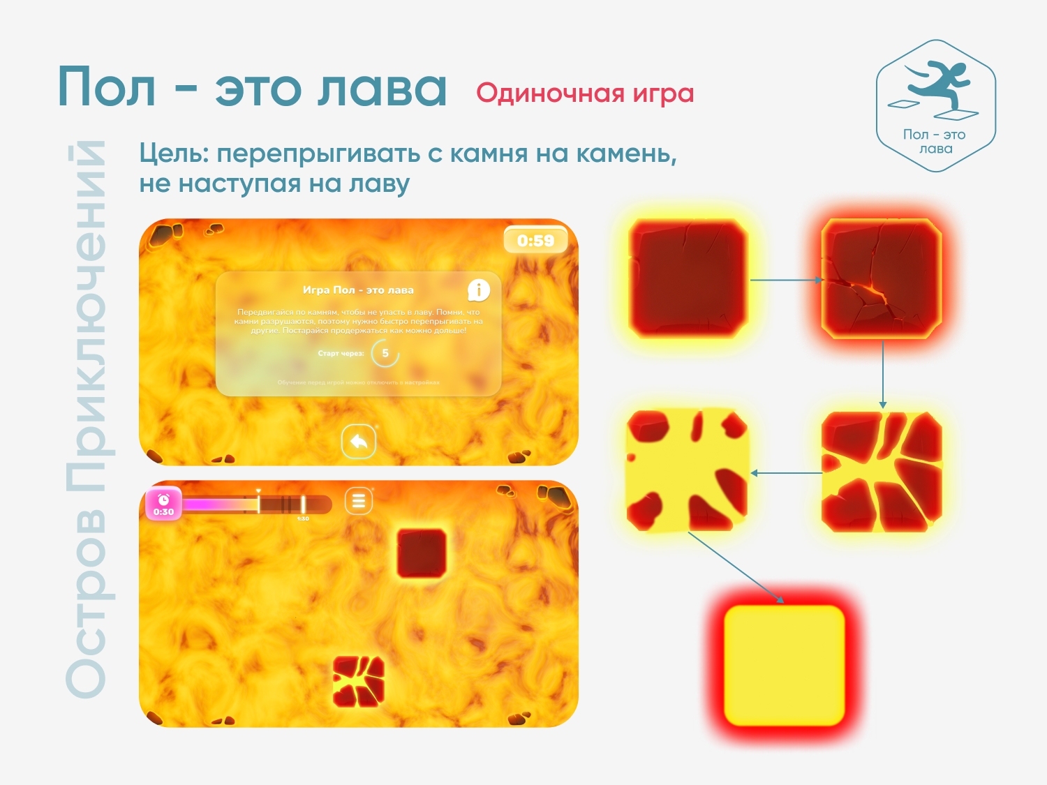 Цель игры — продержаться как можно дольше, перепрыгивая с камня на камень, не наступая на лаву. Осторожно! Камни быстро разрушаются, поэтому, наступив на один камень, сразу же ищи следующий, чтобы перепрыгнуть на него. В процессе игры скорость появления и разрушения камней увеличивается.