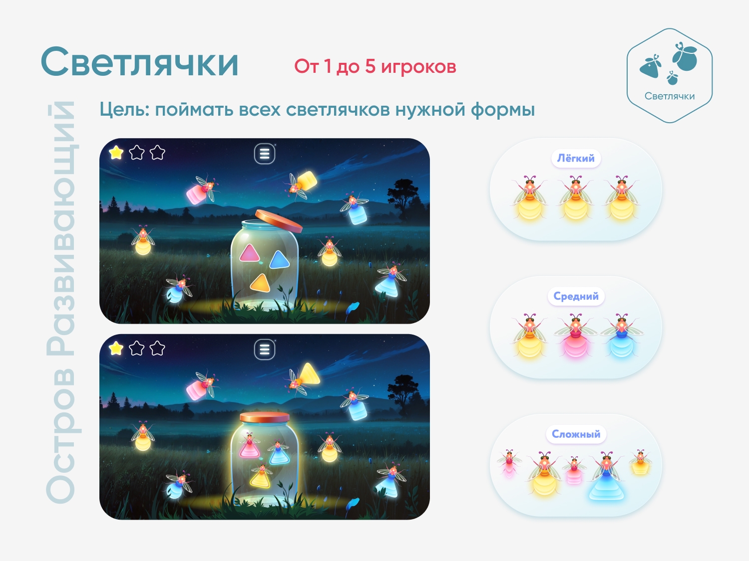 Цель игры — поймать всех светлячков нужной формы. Задание с указанием формы и цвета светлячков для ловли изображено на банке.