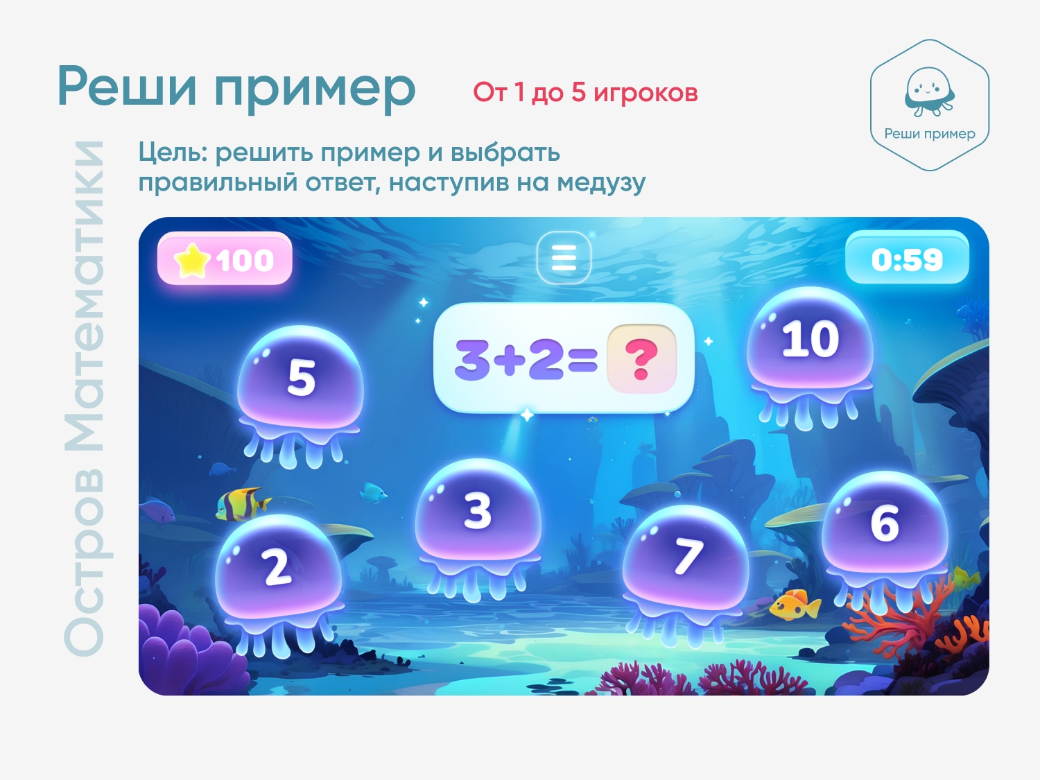 Цель игры — решить пример и выбрать правильный ответ, наступив на нужную медузу.