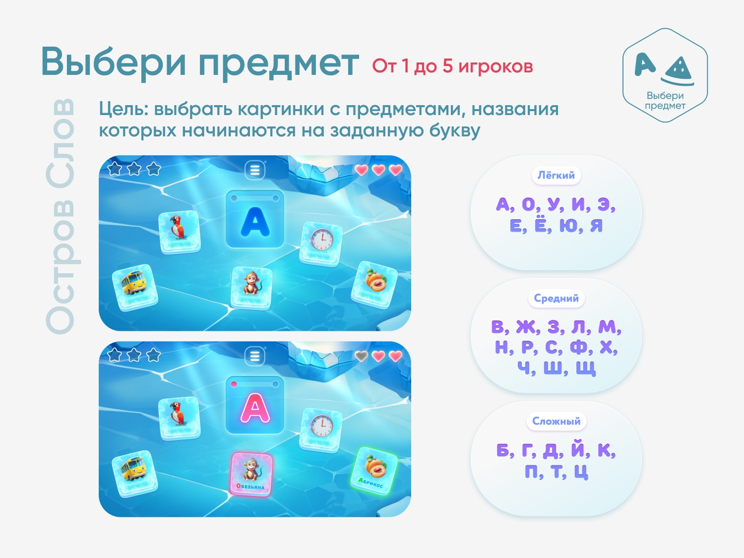 Цель игры — выбрать картинки с предметами, названия которых начинаются на заданную букву. Задание содержит 2 верных ответа.
