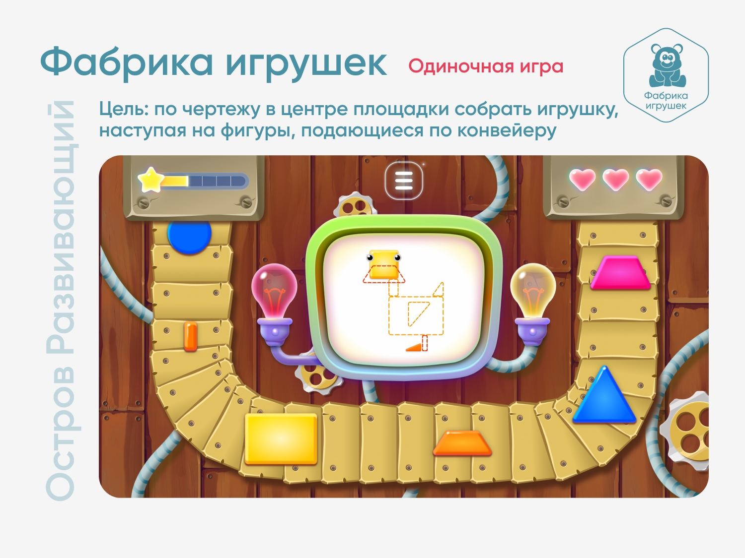 Цель игры — ориентируясь на чертеж в центре площадки, собрать игрушку из геометрических фигур, наступая на верные фигуры, подающиеся по конвейеру.