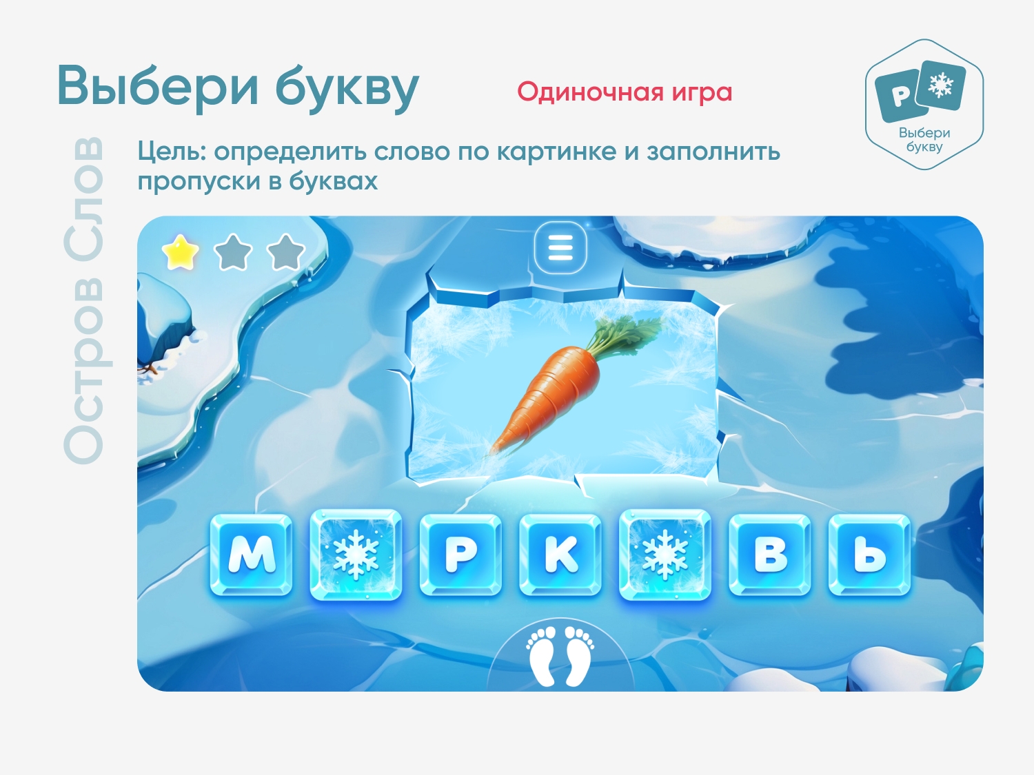 Цель игры — определить слово по картинке и заполнить пропуски в буквах. Для выбора пропущенной буквы игроку нужно наступить на снежинку, после чего появится список возможных ответов.