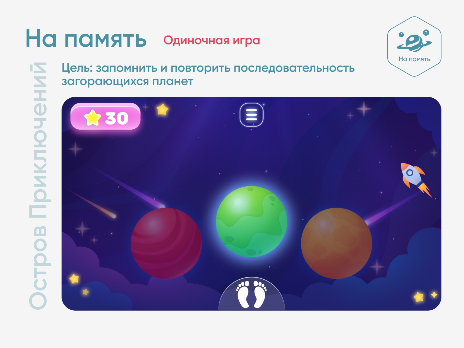 Цель игры — запомнить порядок загорающихся планет и наступать на них в правильной последовательности. Игра продолжается до первой ошибки. Уровней сложности нет.