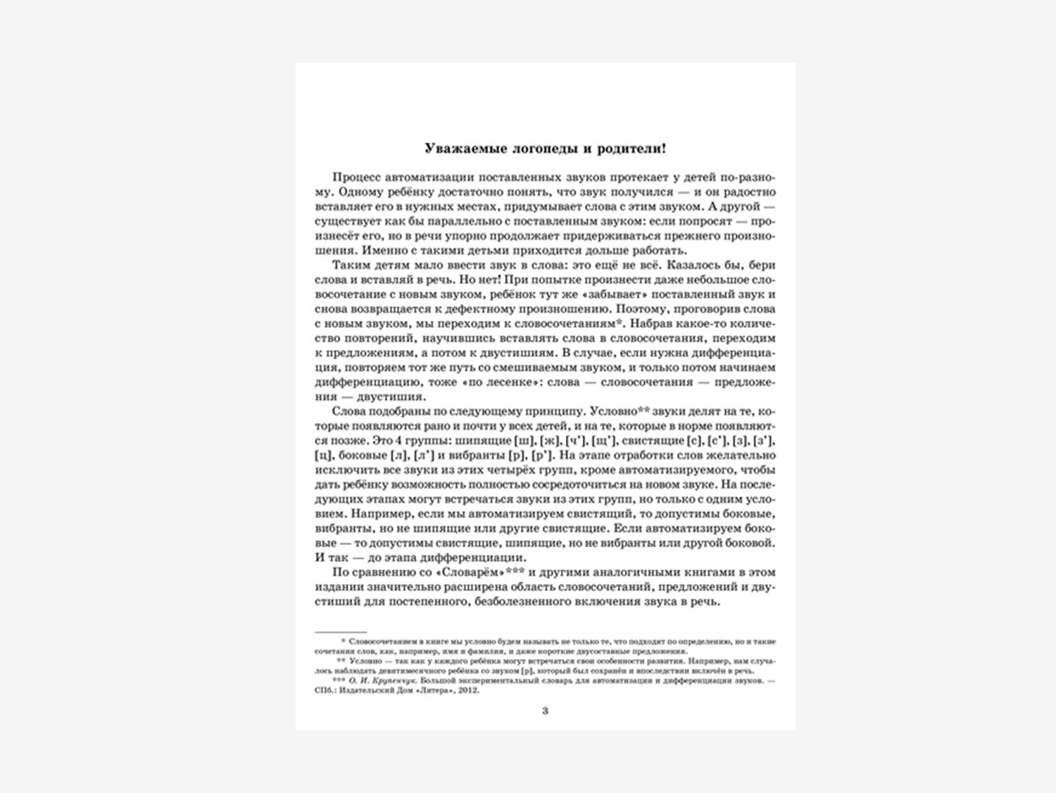 Автор считает, что не существует единой «правильной» схемы, по которой обязательно нужно закреплять звук. Одним детям легче добиться автоматизации звука в начале слова, другим в конце, а третьим – в стечении двух и более согласных. Словарь не ограничен словами, которые обычно знает ребенок, будет дополнительным преимуществом то, что он сможет расширить словарный запас.