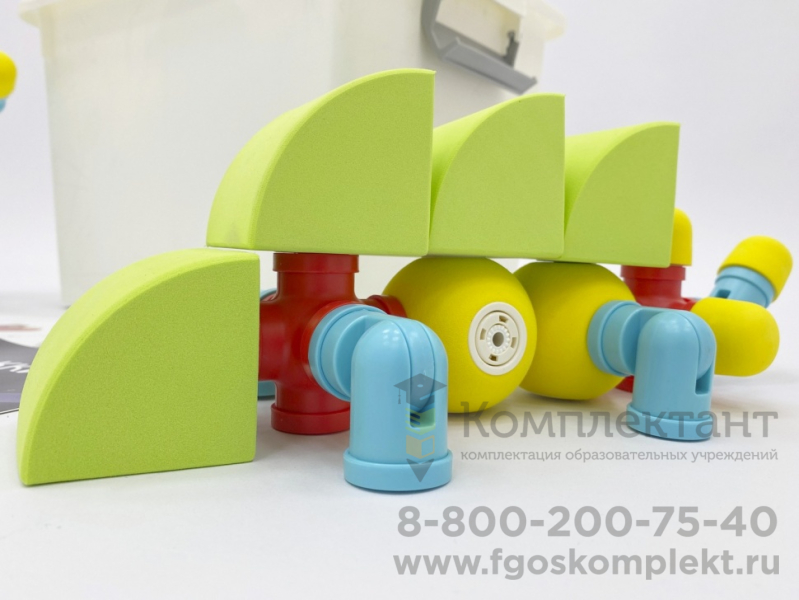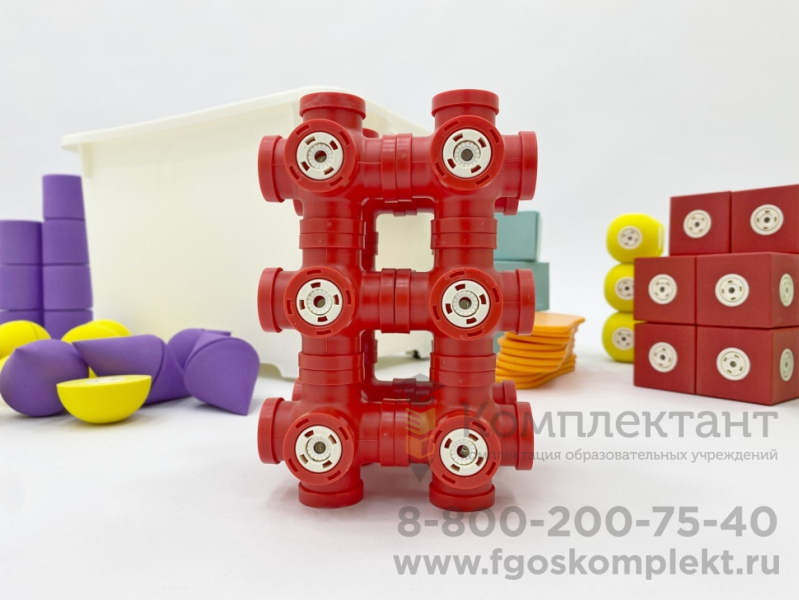 Детали конструктора окрашены в приятные однотонные цвета, со звуковым эффектом погремушки. Каждая из деталей имеет от 1 до 9 вариантов магнитной стыковки, что практически не ограничивает ребенка в конструировании. Простые детали отлично подходят для детей младшей группы ДОУ, детей с ОВЗ и РАС. Более сложные по форме и креплениям детали предназначены для детей средней и старшей группы.