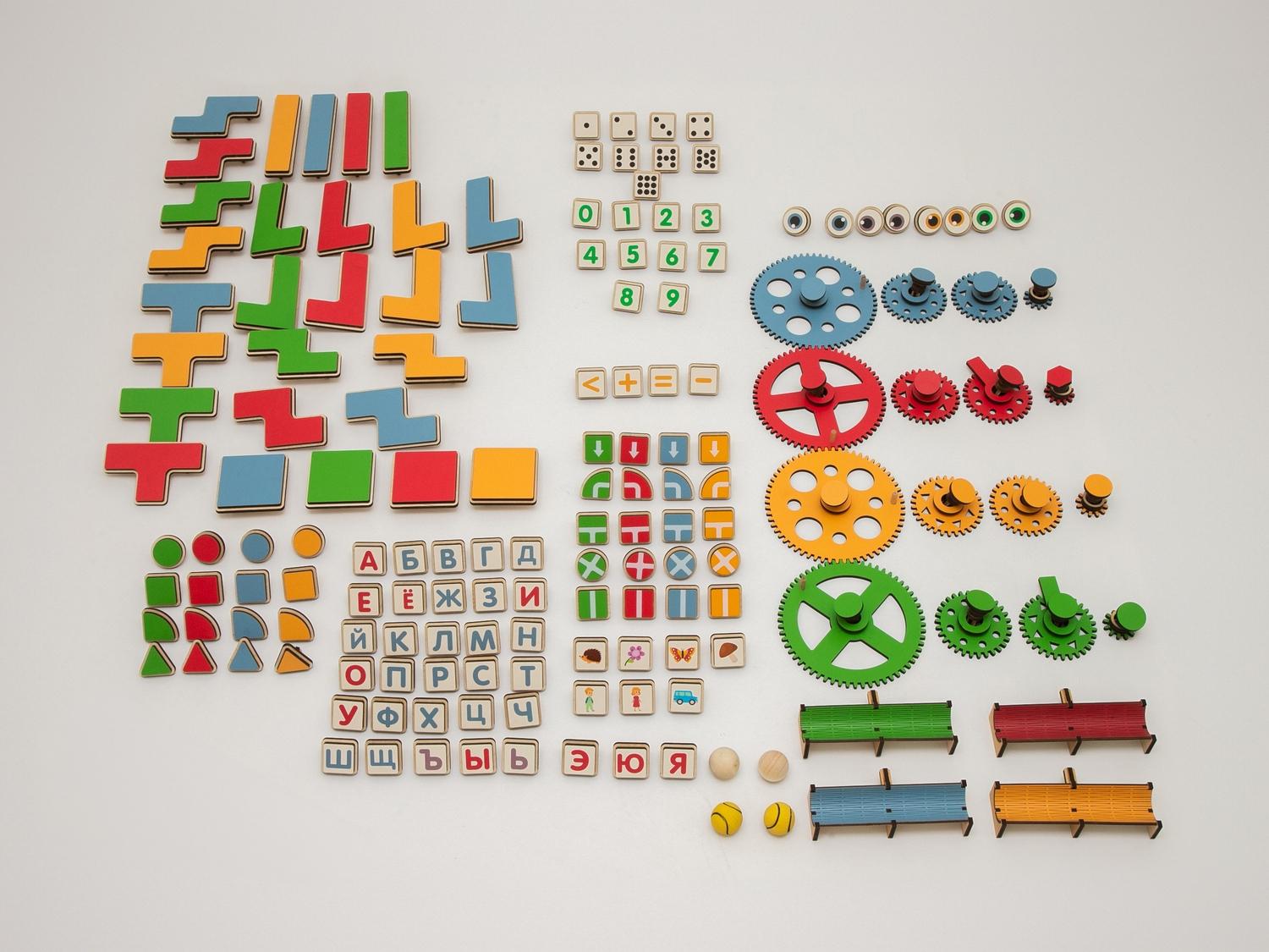 В процессе занятий их можно комбинировать, двигать и переставлять так, как этого требуется исходная задача. Предусмотрена сиSTEMа для хранения всех элементов конструктора.