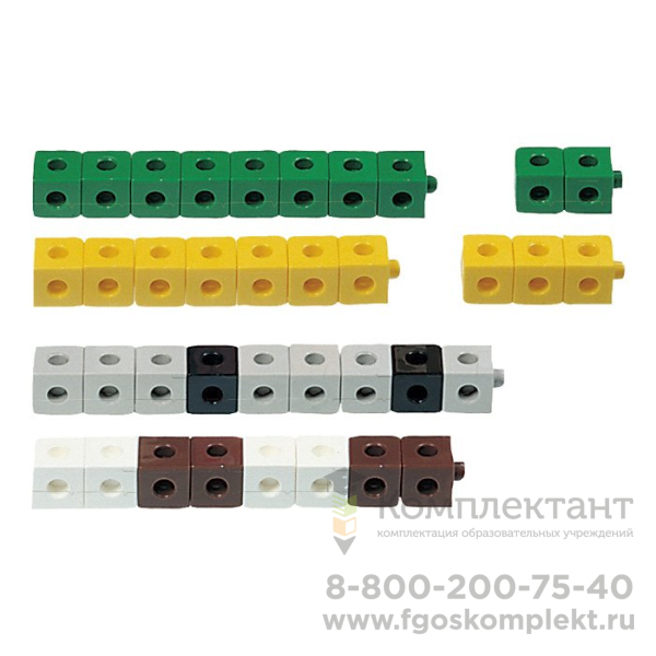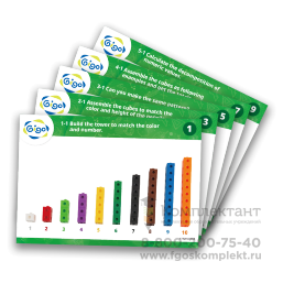 • Кубики разных цветов:10 красных ,10 желтых ,10 зеленых ,10 оранжевых ,10 синих ,10 розовых ,10 белых ,10 черных ,10 коричневых ,10 серых + 5 карточек с заданиями