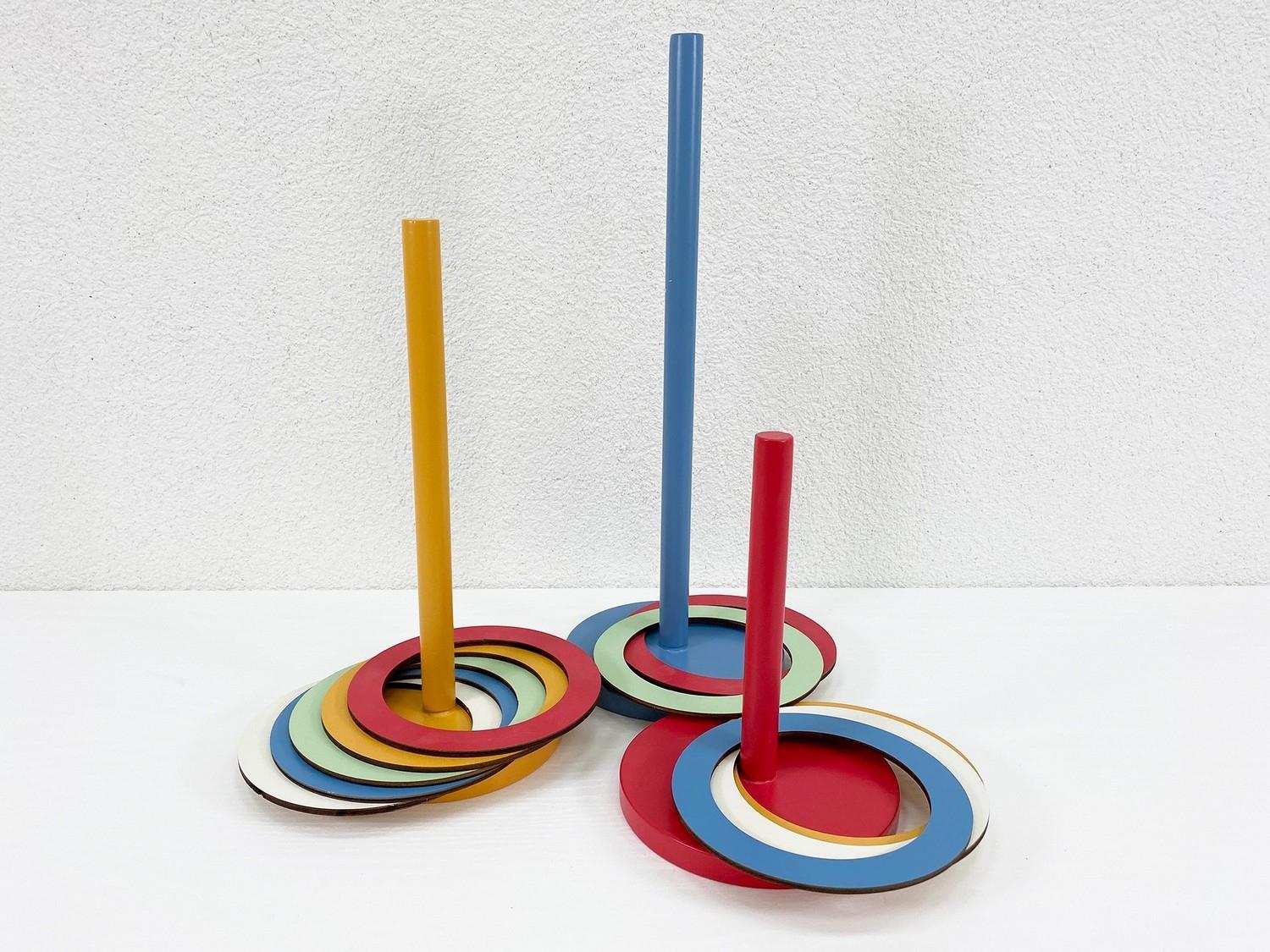 Кольцеброс – традиционная игра на развитие ловкости, меткости и глазомера. Состоит из трёх цветных колышков разной высоты и комплекта колец, которые нужно накинуть на эти колышки с определённого расстояния.