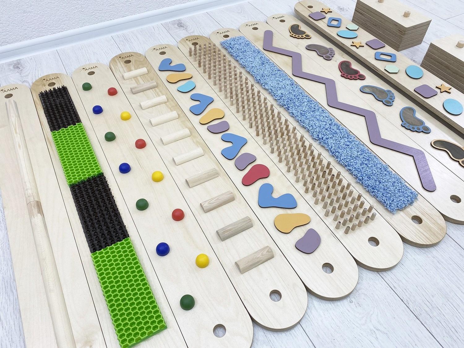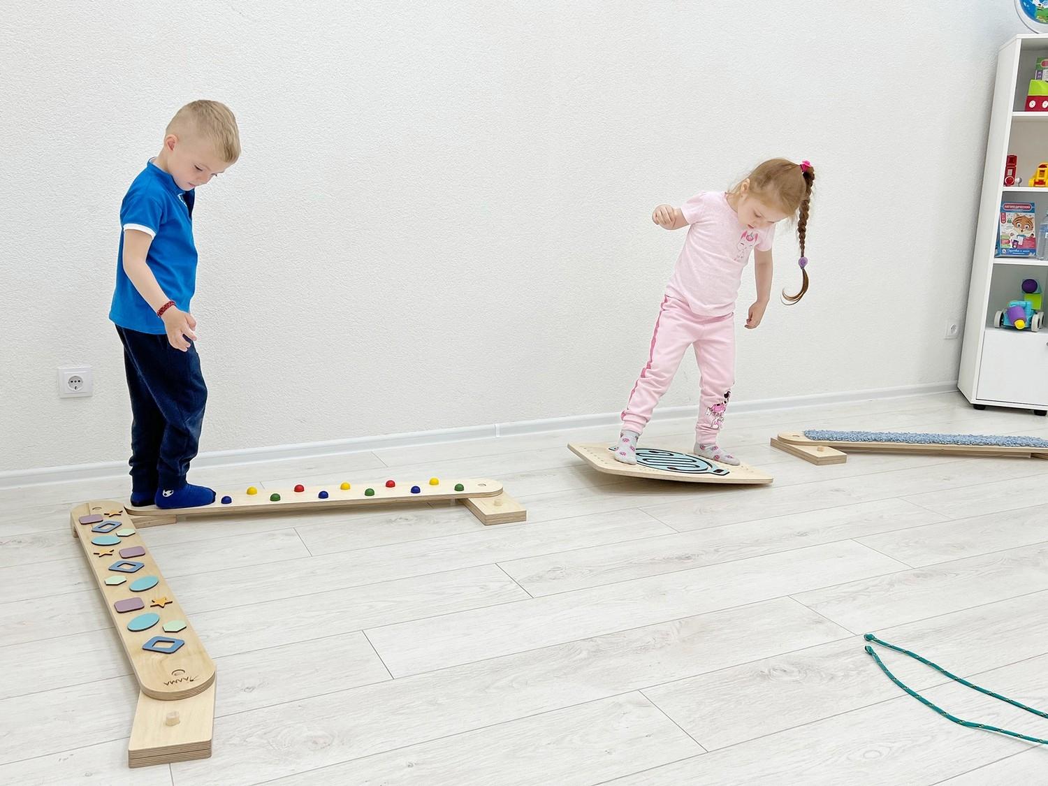 Сенсорные балансировочные мостики АЛМА – конструктор из 10 троп, 10 брусков и 2 стартовых блока, применяется для развития равновесия, координации движения, профилактики сколиоза и плоскостопия у детей. Разный рельеф и материал покрытия мостиков служит развитию сенсорной чувствительности и стимуляции рефлекторных точек на ногах.