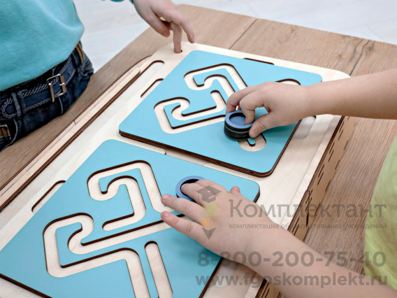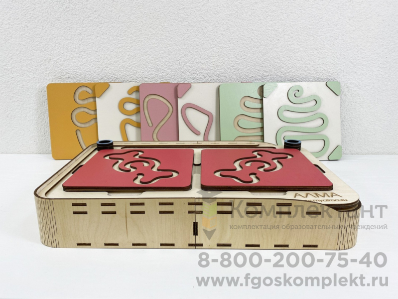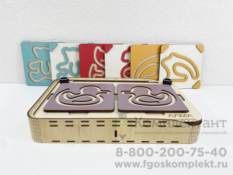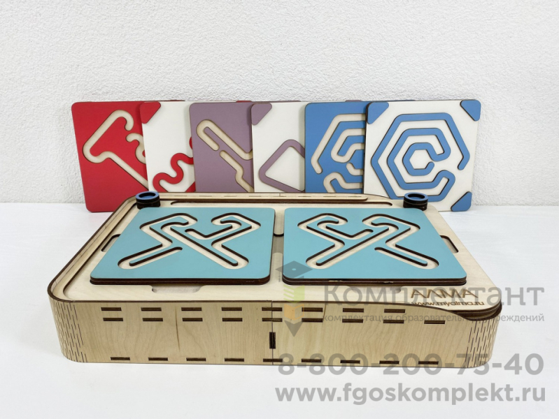 Это нейроигрушка для развития межполушарного взаимодействия. Состоит из коробки-основания и цветных лабиринтов-вкладышей. Два лабиринта с зеркально изображёнными картинками устанавливаются в пазы, и ребёнок проходит их с помощью специальных пальчиковых фишек.