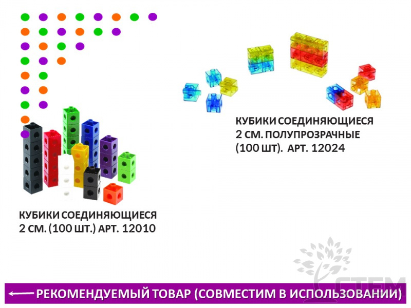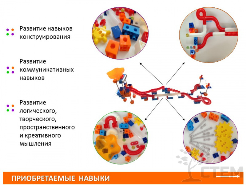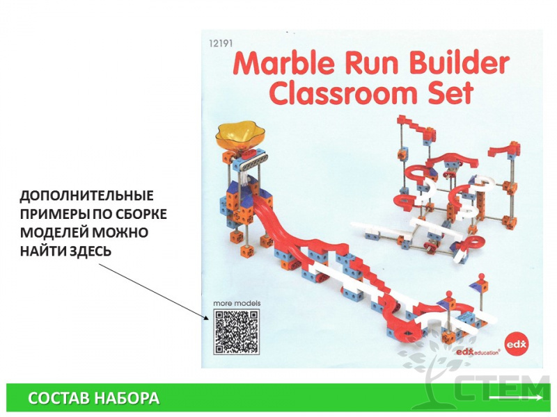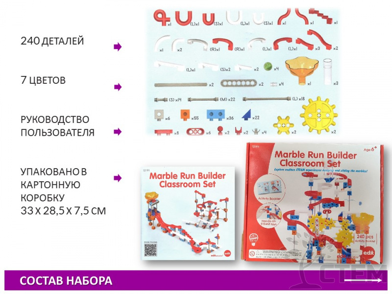 В комплект входят 240 деталей: горки, шарики, шестерёнки, 2-х см. соединяющиеся кубики, кирпичики, стержни, воронка и другие соединительные элементы, а также буклет с заданиями.