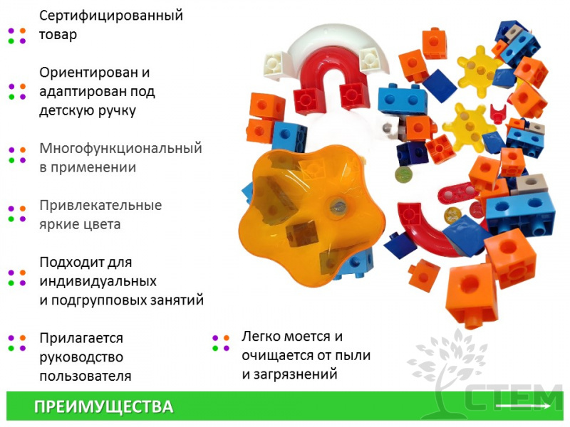 Конструктор способствует развитию воображения, мелкой моторики, творческих способностей, пространственного и критического мышления.