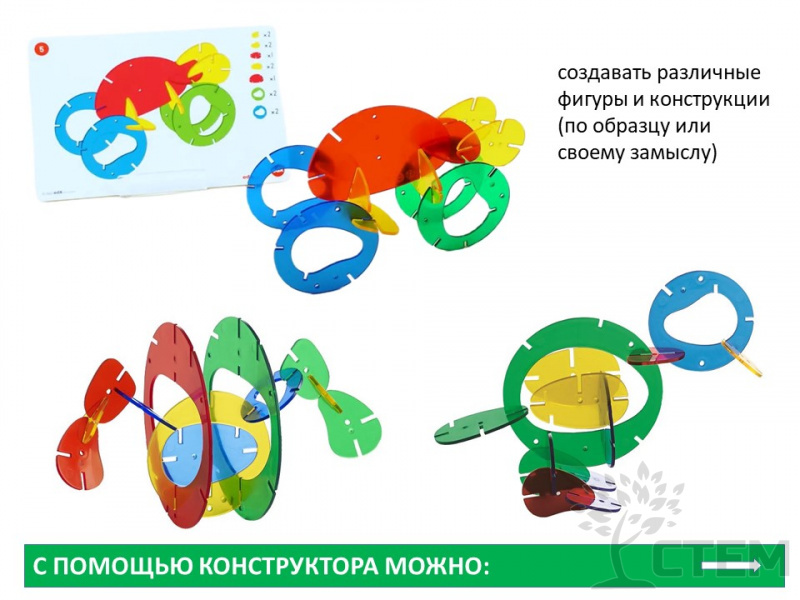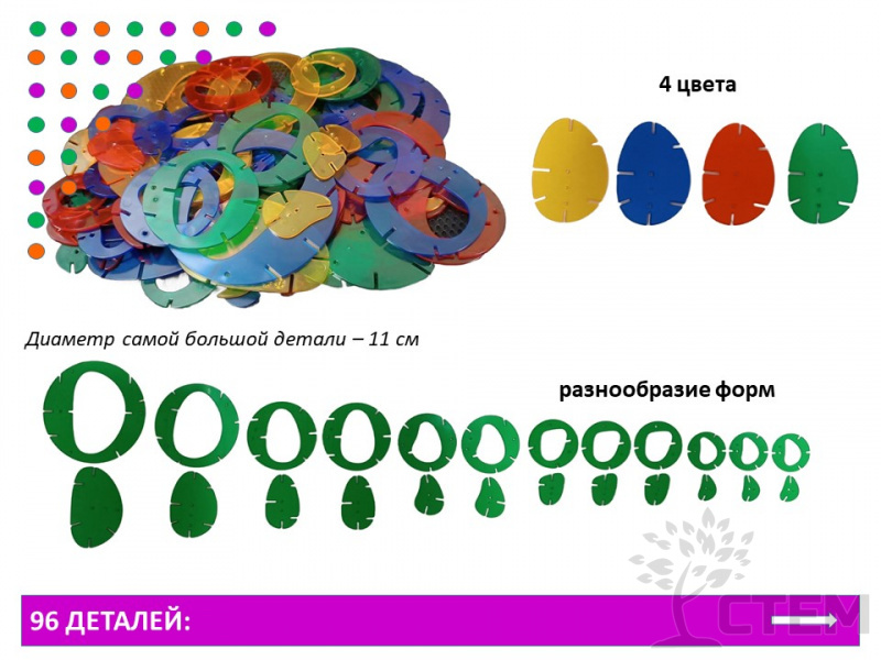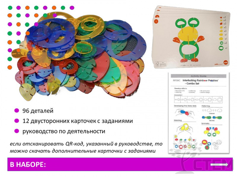 Набор включает: 96 деталей 4-х цветов, 12 различных форм и 12 двусторонних карточек с заданиями. Поставляется в пластиковом контейнере.