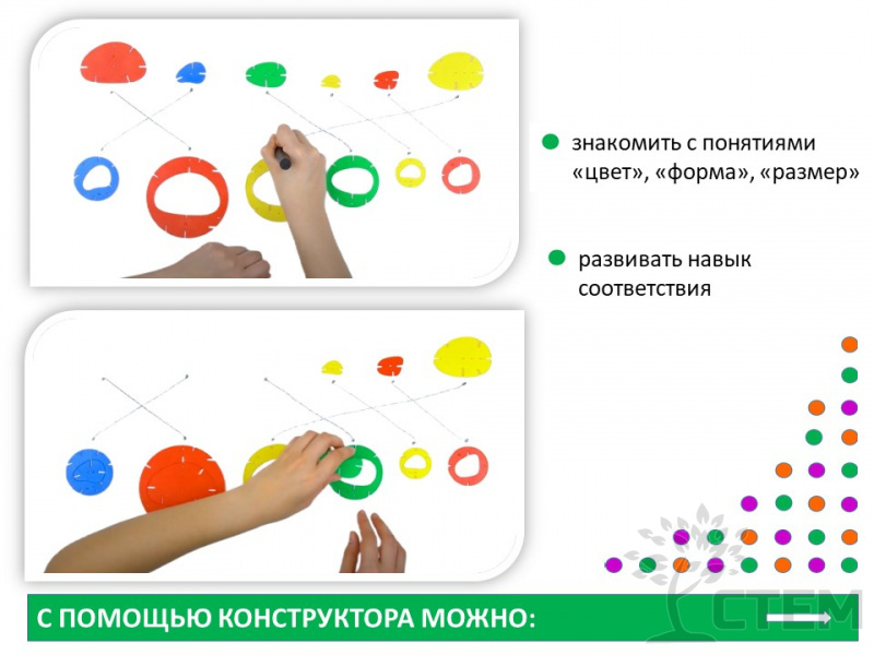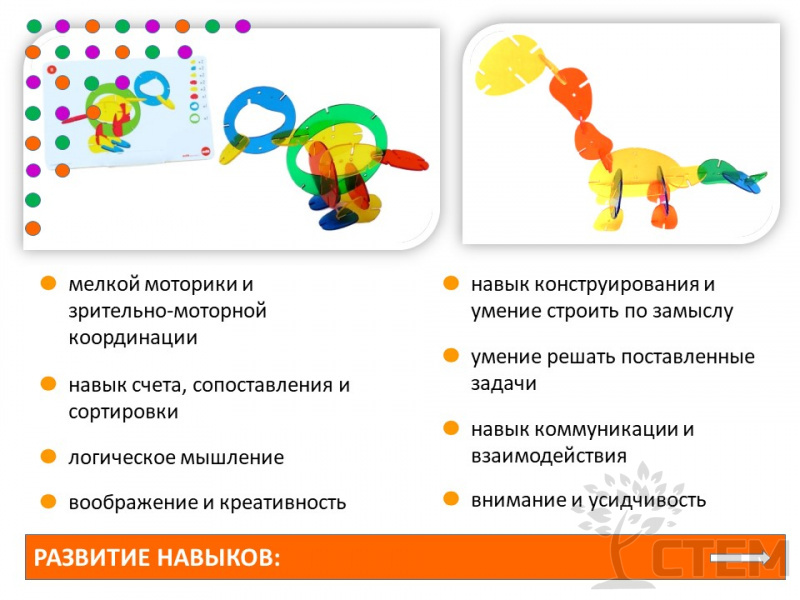 Набор способствует развитию мелкой моторики, творческого мышления, навыка конструирования, знакомит детей с понятиями "цвет", "форма", "размер", развивает усидчивость и терпение.