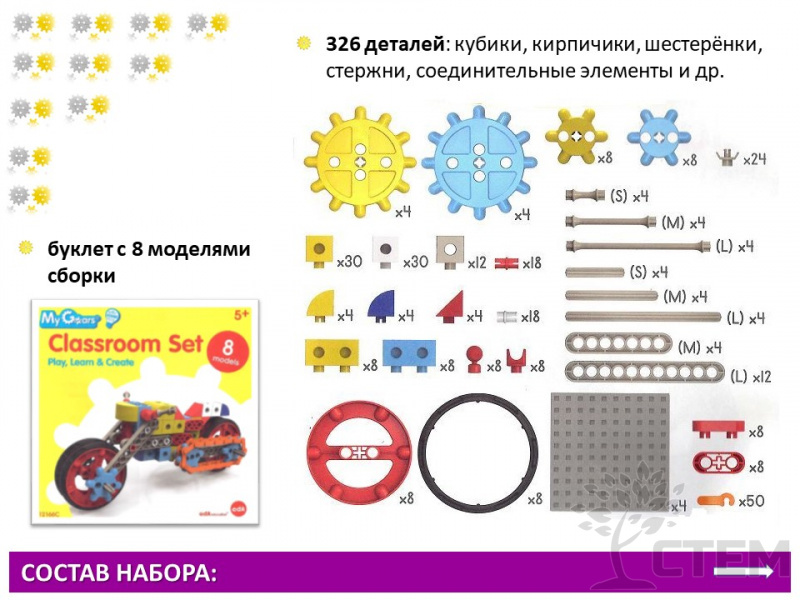 - буклет с 8 моделями сборки (с пошаговой инструкцией и перечнем деталей, входящих в состав моделей).
