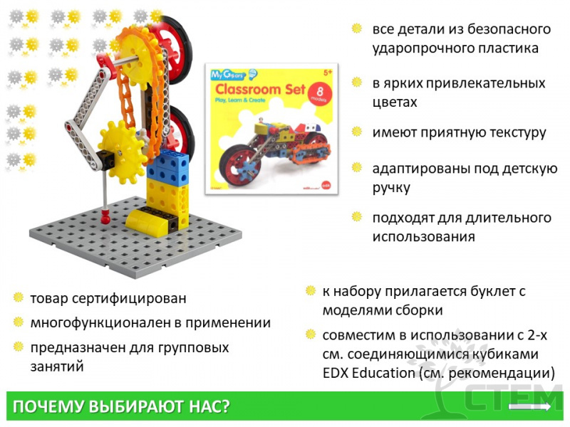 Набор для конструирования «Занимательные шестеренки и 2-х см. соединяющиеся кубики» отлично подойдет для юных инженеров.