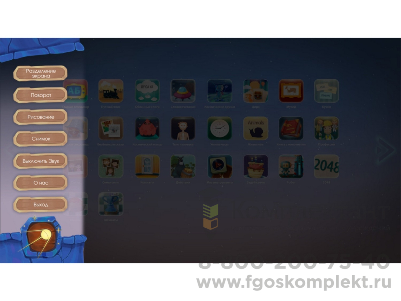 Уникальное программное обеспечение, включающее более 80 обучающих игр и 110 тестов, направленных на развитие памяти, внимания, логики, изучение счета и английского языка. Также в программное обеспечение входят приложения: рисование, раскраски, шахматы и шашки. Прохождение всех игр способствует расширению у ребенка знаний об окружающем его мире.