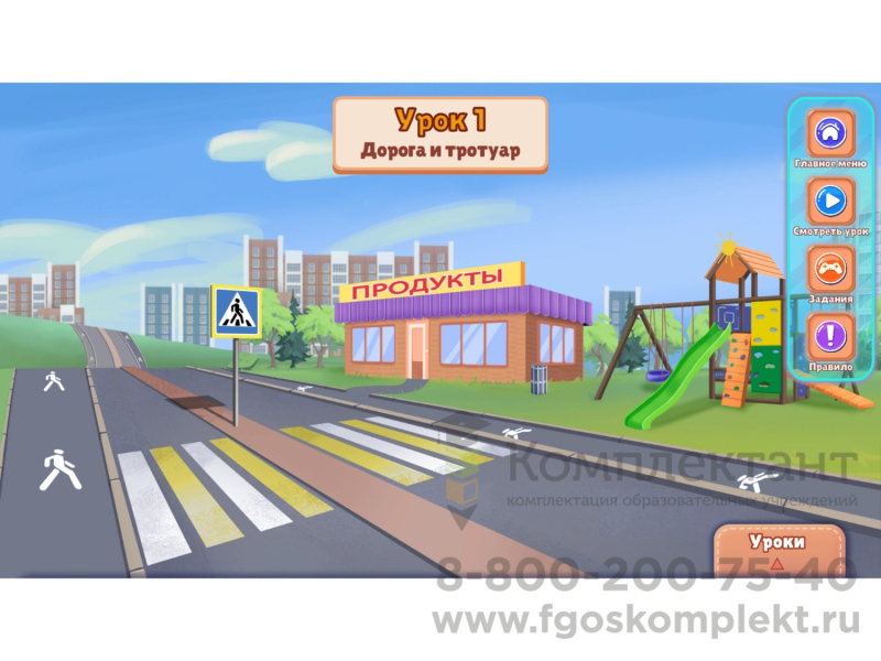 Программное обеспечение имеет интуитивно понятный интерфейс, красочную компьютерную анимацию и голосовую озвучку каждого урока. После урока идёт несколько развивающих игр на усвоение полученных знаний – это викторины, сортеры, пазлы, обобщение-исключение, классификация и другие. Преподавателю не составит труда вовлечь малыша в процесс изучения ПДД, ведь это не нудная зубрёжка, а весёлый и увлекательный процесс с применением современных компьютерных технологий!
