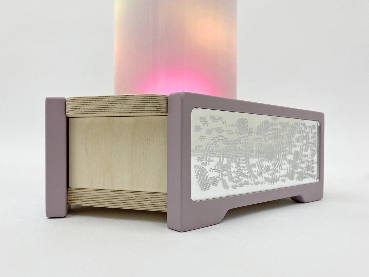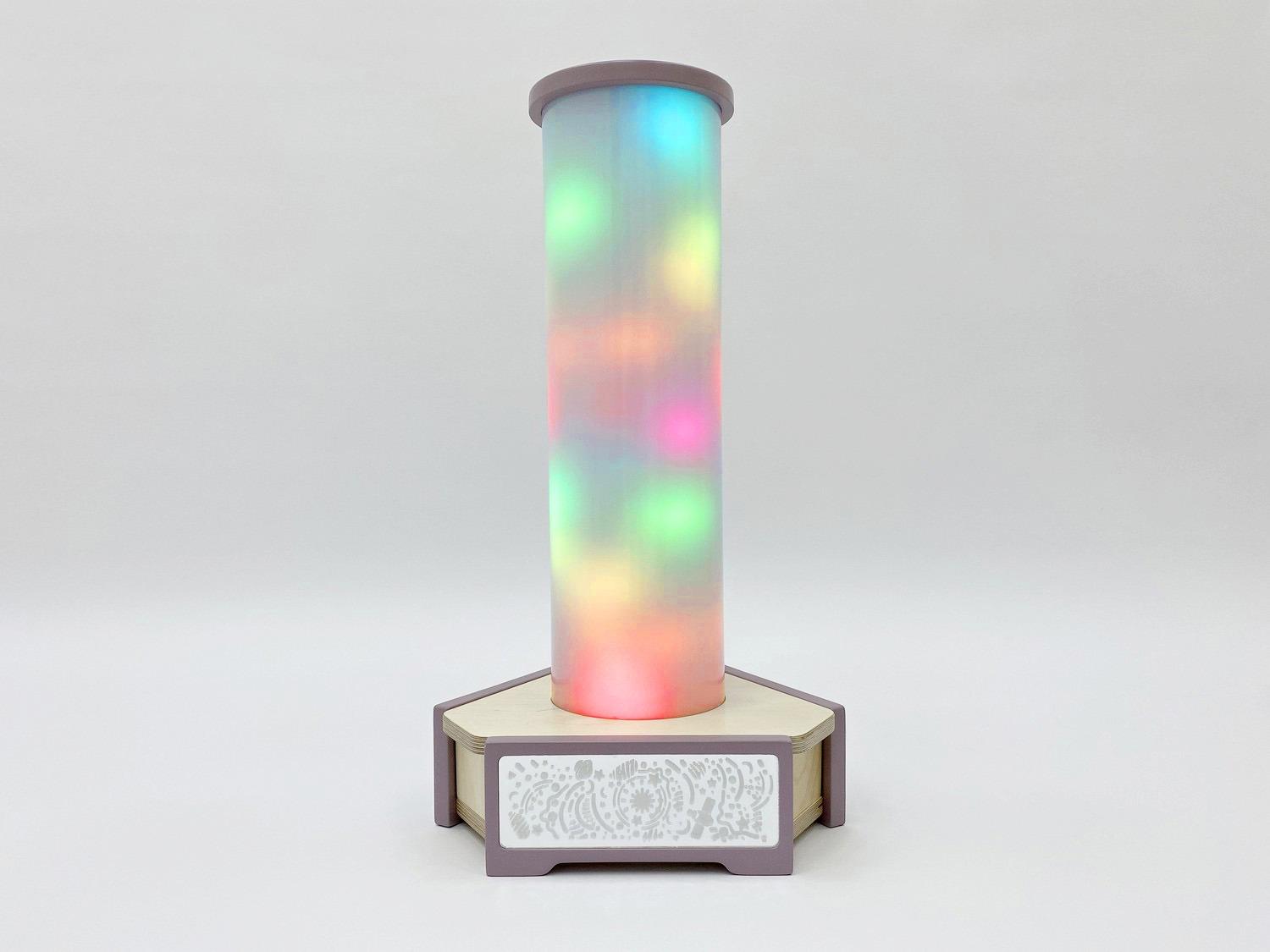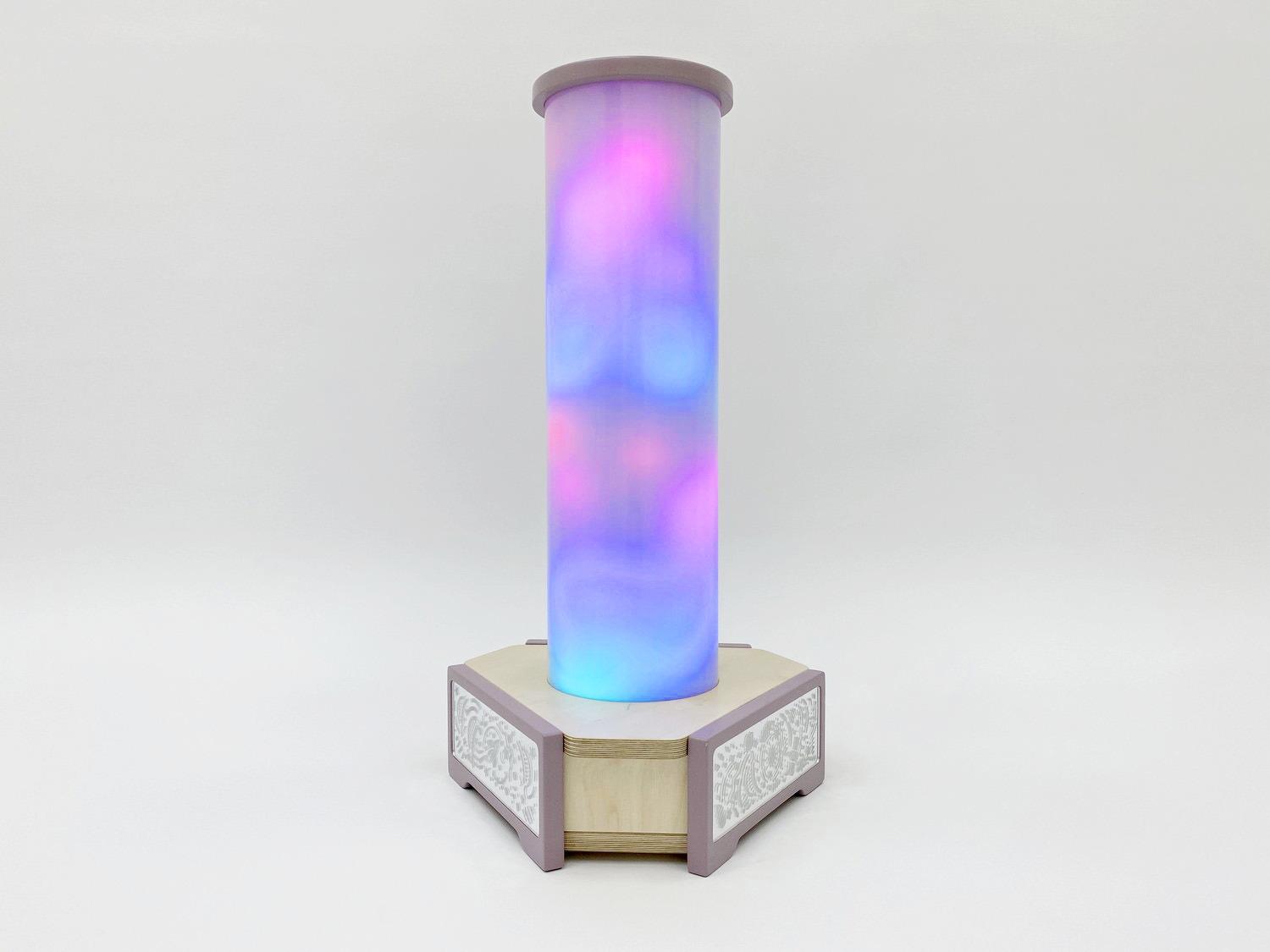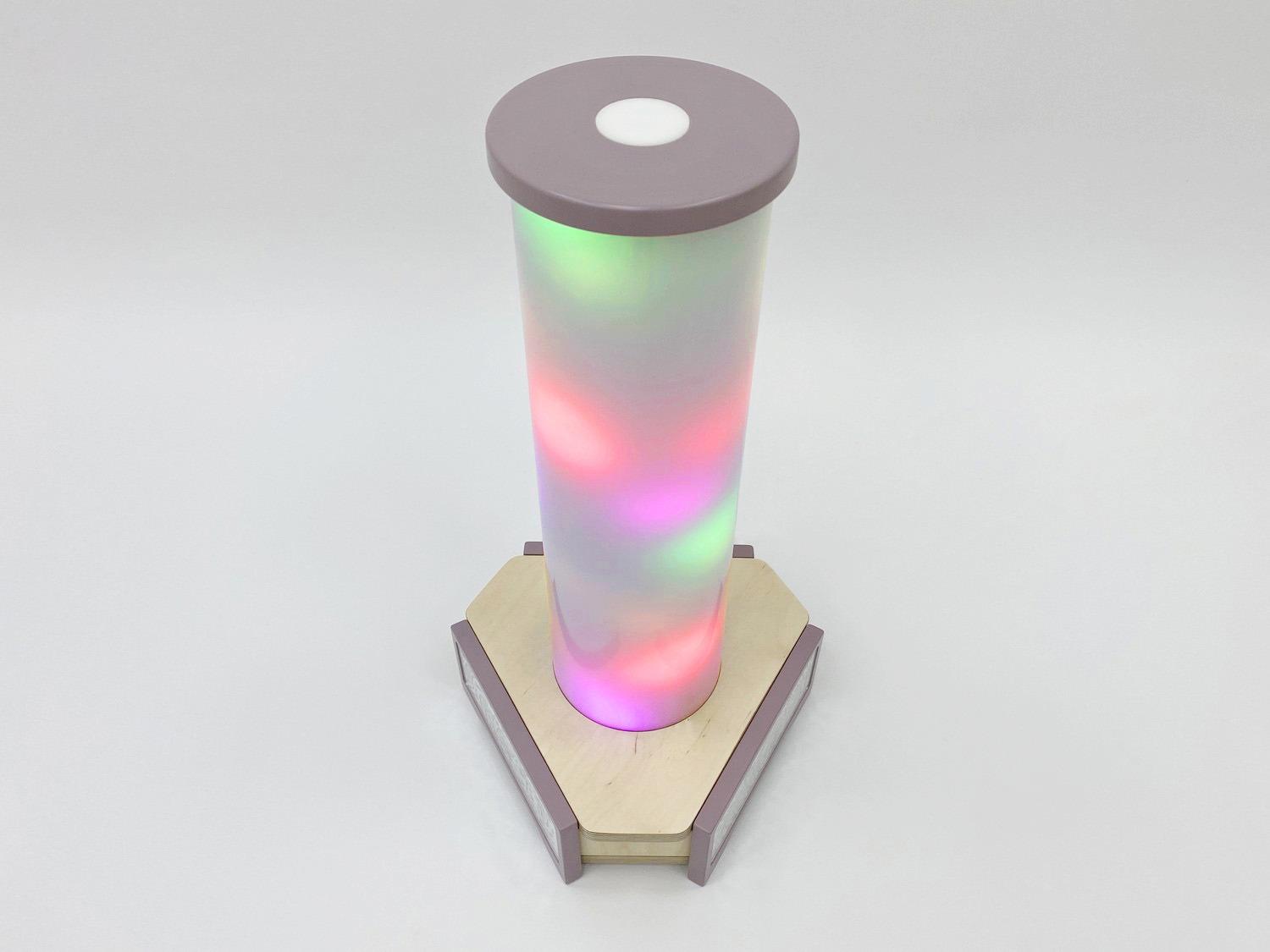 «Лампус» состоит из жёсткого основания, куда прячется блок питания и контроллер, и матового акрилового цилиндра, который и является светящейся поверхностью. Основание колонны изготовлено из берёзовой фанеры в сочетании с мдф, покрытым эмалью и жаропрочным лаком Renner на водной основе. Лак защищает изделие от загрязнения и истирания. Вставки изготовлены из безопасного акрилового зеркала с гравировкой.