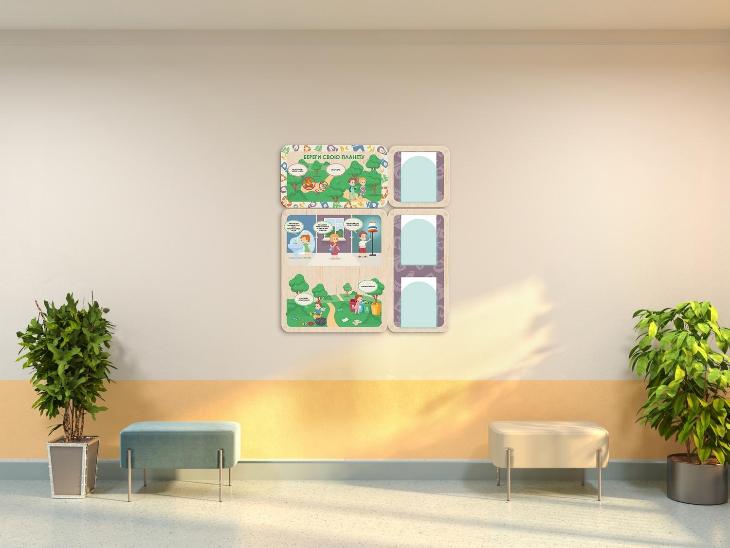 Информационный стенд для оформления стен в детских садах, начальной школе и организациях дополнительного образования. Красочные наглядные иллюстрации с простыми подписями помогут дошколятам понять правила экологичного поведения, даже если они ещё не умеют читать. Важная информация для родителей может размещаться в акриловых карманах около каждого стенда.
