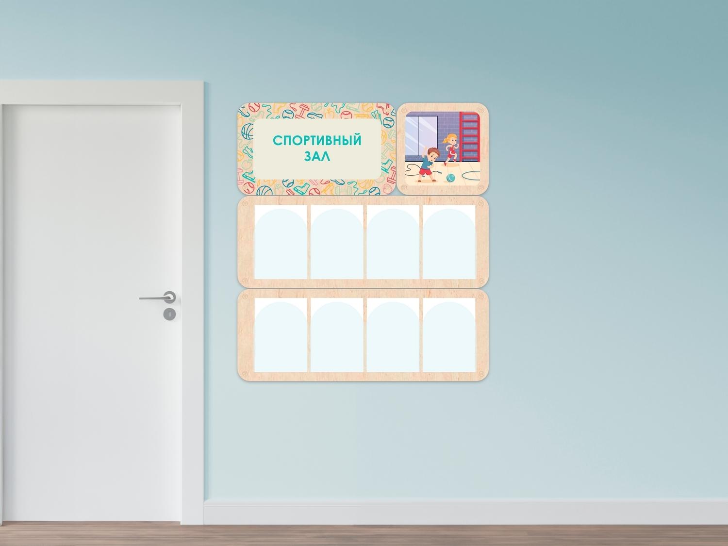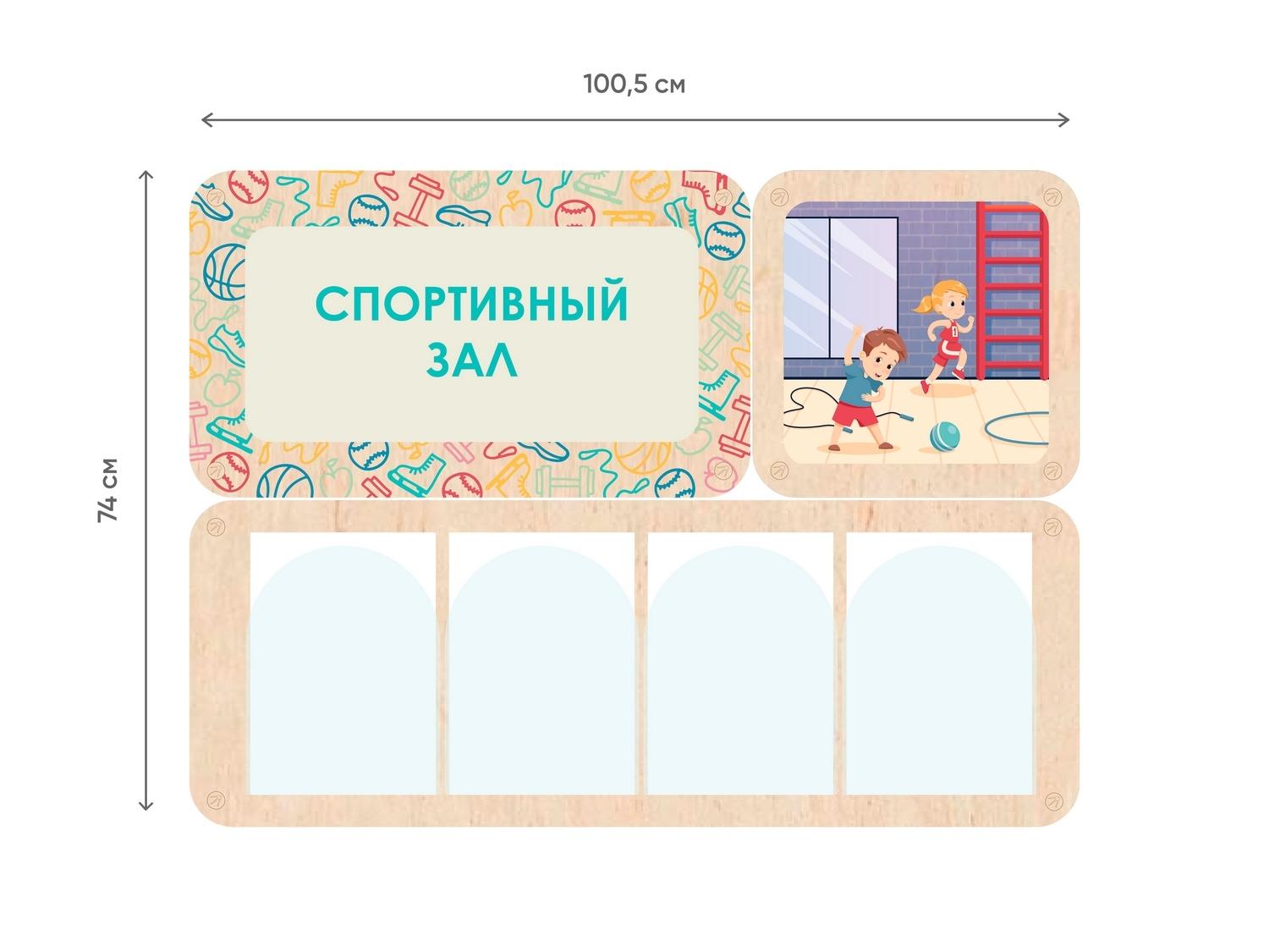 Стенд информации для детского сада, который рассказывает детям и родителям важные сведения о работе спортивного зала. В акриловых карманах можно разместить документацию, расписание занятий, правила и многое другое. Яркий заголовок акцентирует внимание посетителей на этой информации.