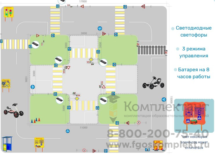 4. Знак дорожный типоразмер 40 на стойке с основанием, Имитация четырёхстороннего перекрестка 11*9м, Учебно-игровой макет "Пост ДПС" , Учебно-игровой макет "Заправка" АЗС (мобильный/стационарный), Бизи-стенд "Светофоры", Бизи-стенд "Перекресток" -, Бизи-стенд "Дорога в школу", Медаль для вручения по результатам изучения ПДД, Набор ролевых жилетов, Учебно-методический плакат "Правила безопасности для пешехода", Учебно-методический плакат "Дорожные знаки пешеходу", Учебно-методический плакат "Дорожные знаки водителю", Жезл регулировщика детский, Веломобили.