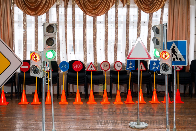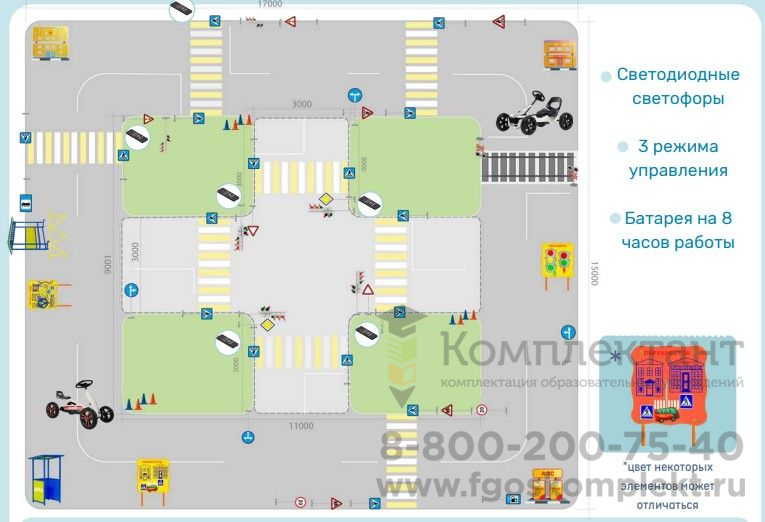 Комплектация: Набор светодиодных светофоров "Четырехсторонний перекресток" мобильный, Набор светодиодных светофоров "Пешеходный переход" мобильный, Светофор "ЖД переезд" мобильный , Знак дорожный типоразмер 40 на стойке , Имитация четырёхстороннего перекрестка, Учебно-игровой макет "Пост ДПС", Учебно-игровой макет "Заправка" АЗС, Бизи-стенд "Перекресток", Бизи-стенд "Дорога в школу", Учебно-игровой макет "Детский сад/Школа", Учебно-игровой макет "Больница", Учебно-игровой макет "Остановка"(мобильный/стационарный), Учебно-методический плакат "Правила безопасности для пешехода", Учебно-методический плакат "Дорожные знаки пешеходу", Учебно-методический плакат "Дорожные знаки водителю", Жезл регулировщика детский, Набор конусов сигнальных 33 см, Набор ролевых жилетов, Веломобили - 2 шт