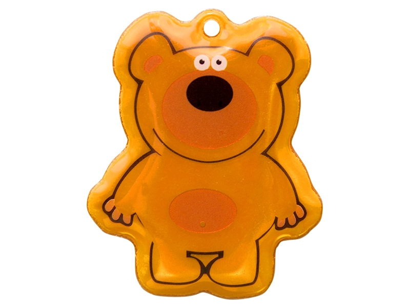 Световозвращающая подвеска высокого качества представляет собой элемент в виде медвежонка, выполненный из скрепленного между собой эластичного световозвращающего материала. Коэффициент световозвращения поверхности подвески составляет 200 кд/лк*м2 согласно требованиям ГОСТ Р 50971-2011. Цвет световозвращающего материала - оранжевый. На лицевой стороне подвески с применением УФ-печати нанесен цветной тематический рисунок, соответствующий возрастной категории (дошкольники и школьники): "Медвежонок".