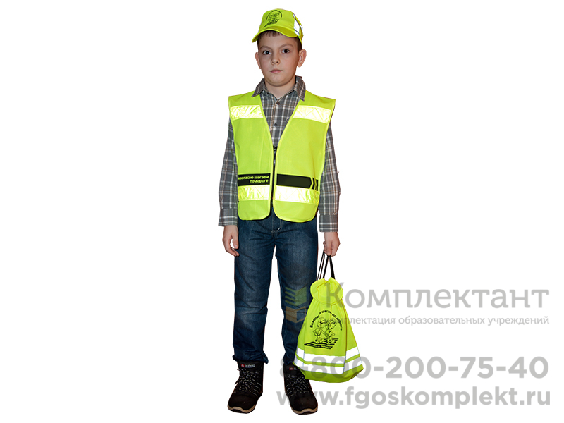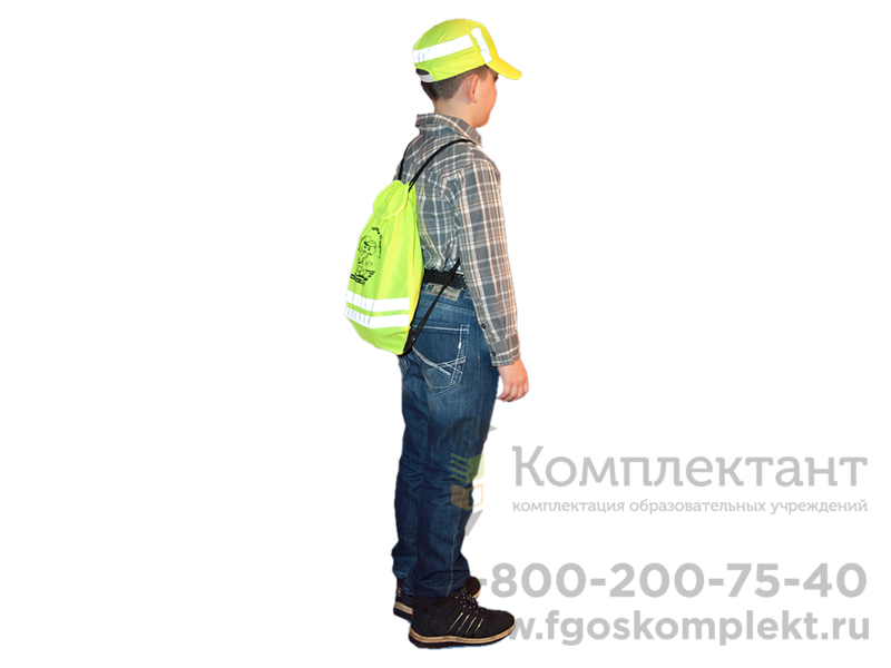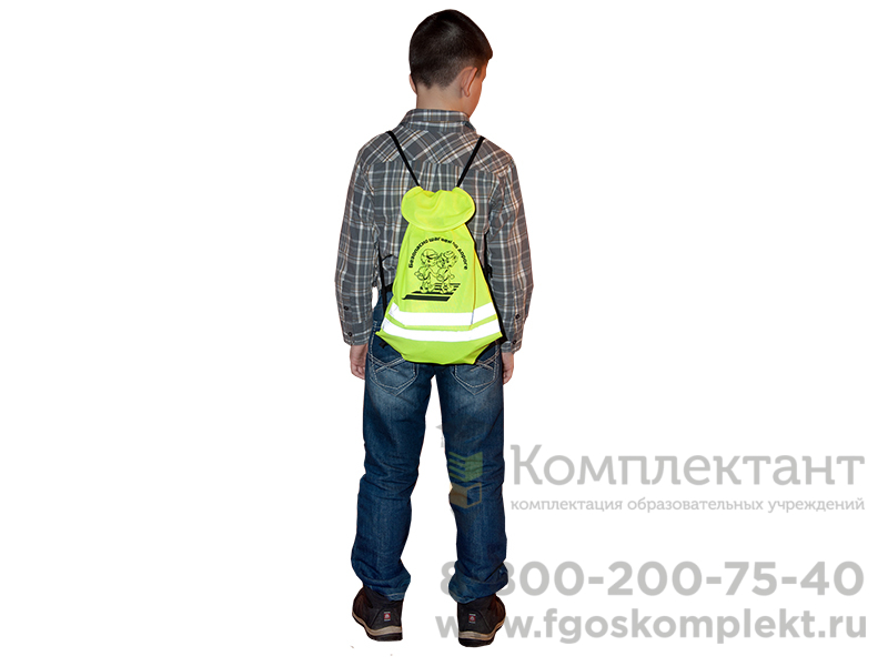 Световозвращающий рюкзак представляет собой мягкий заплечный мешок желтого цвета с двумя световозвращающими полосками, по бокам которого находятся две лямки, наверху - текстильная застежка, внизу - вставки из кожзаменителя с люверсами, а спереди нанесен рисунок и слоган.