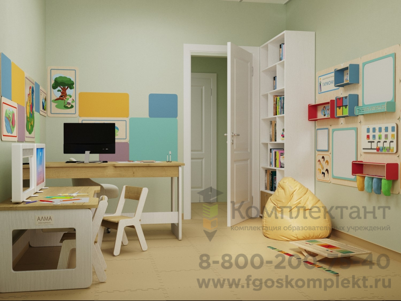 Готовый комплект содержит: стол психолога-дефектолога, рабочий стол для детей, компьютер специалиста с программным обеспечением для психологов «Профиль психолога АЛМА», интерактивную сенсорную панель с набором общеразвивающих программ для дошкольников, дидактическую панель «Гармония», кресла-мешки, набор корпусной мебели, нейротренажеры, методические материалы, обучающие пособия и многое другое.