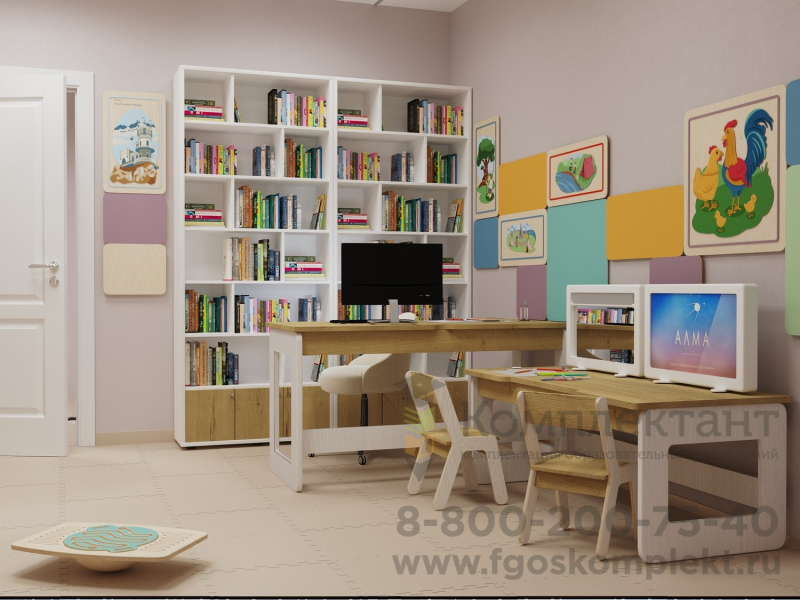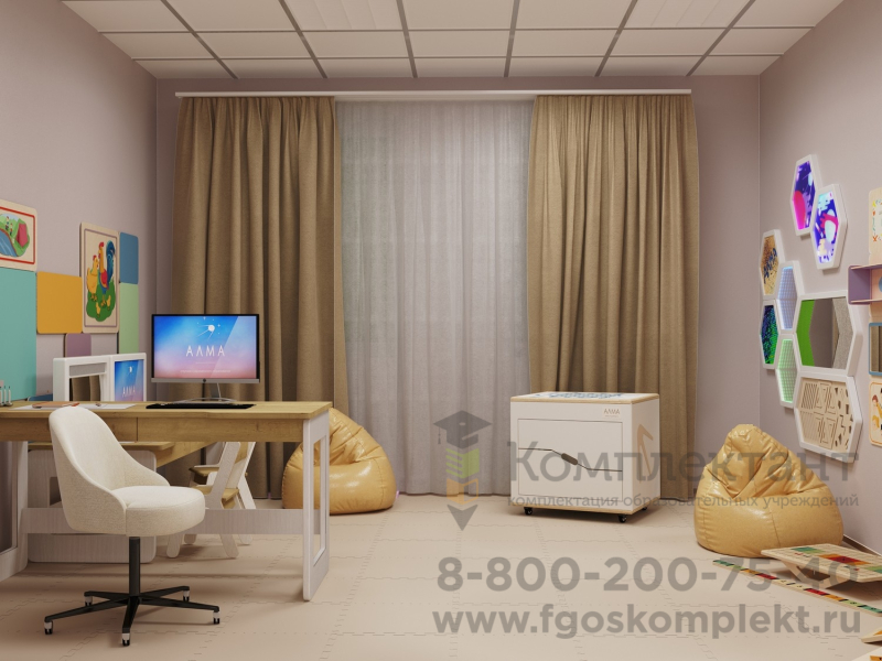 Готовый комплект содержит: стол психолога-дефектолога, рабочий стол для детей, компьютер специалиста с программным обеспечением для психологов «Профиль психолога АЛМА», интерактивную сенсорную панель с набором общеразвивающих программ для дошкольников, дидактическую панель «Гармония», кресла-мешки, набор корпусной мебели, нейротренажеры, методические материалы, обучающие пособия и многое другое.