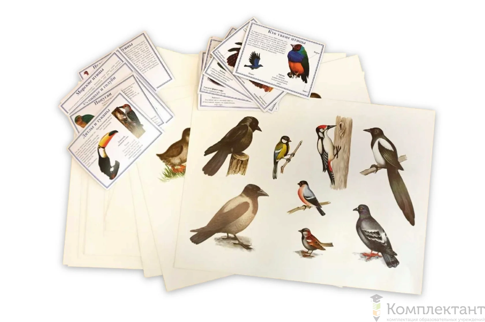 2) Набор раздаточных карточек «Птицы» (формат 150×200 мм.) — 20 шт. На карточках изображены разные виды птиц — дикие, домашние, декоративные, а также — особенности их строения, гнездования, выведения потомства, взаимоотношений. Упаковка — наличие.