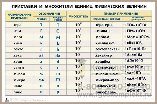 Основные технические характеристики:Таблица содержит информацию о приставках и множителях физических величин, их обозначения и примеры применения формат, мм 900х600; плотность бумаги, г/м2 150; двусторонняя матовая ламинация.