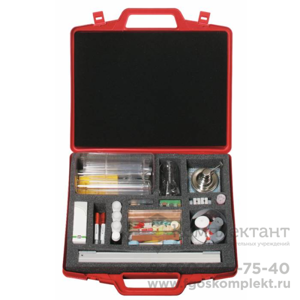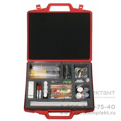 В наборе (для 1 рабочей группы или для демонстрации)*: направляющий рельс, кювета, термометр, трубки, пробирки, колба Эрленмейера, воронка, спиртовка, индикаторный раствор и индикаторные полоски, краситель пищевой, пипетка, препаровальная игла, надувные шары, спички, свеча, фильтры, магнит цилиндрический, биметаллическая пластина, масло растительное, поваренная соль, сахарный песок, лимонная кислота, образцы материалов для исследования физических свойств (дерево, пенопласт, картон, шпагат, ткань х,б, скрепки металлические, зубочистки деревянные, бумага, пластик,алюминий, железо, медь, цинк, никель, латунь, жесть, стекло, резина,фарфор,поролон, камушек и др.),аксессуары.