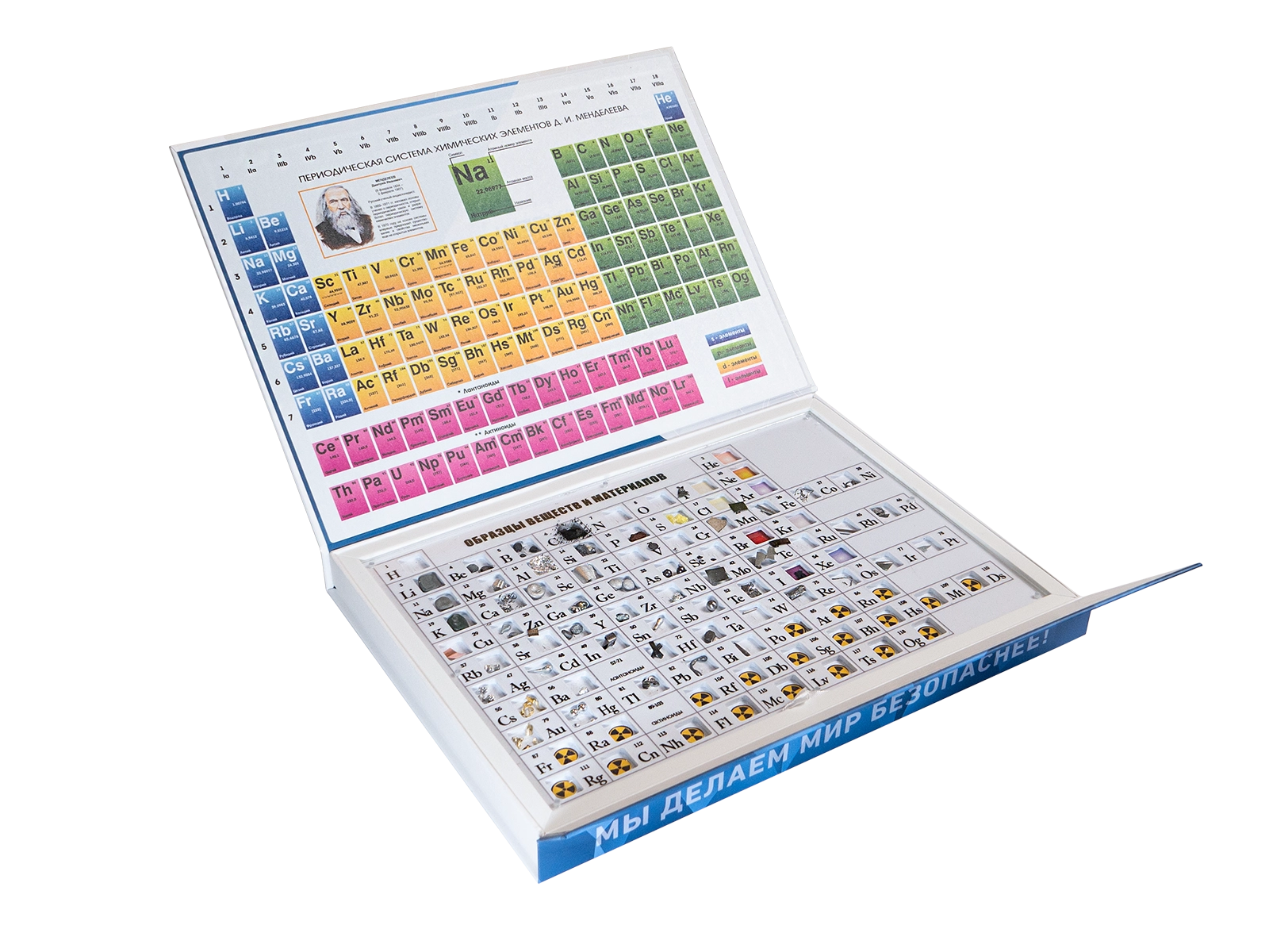 Набор представляет собой Периодическую систему Д. И. Менделеева с набором образцов химических элементов. Образцы помещены в герметично упакованные прозрачные контейнеры, с порядковым номером и символом химического элемента.