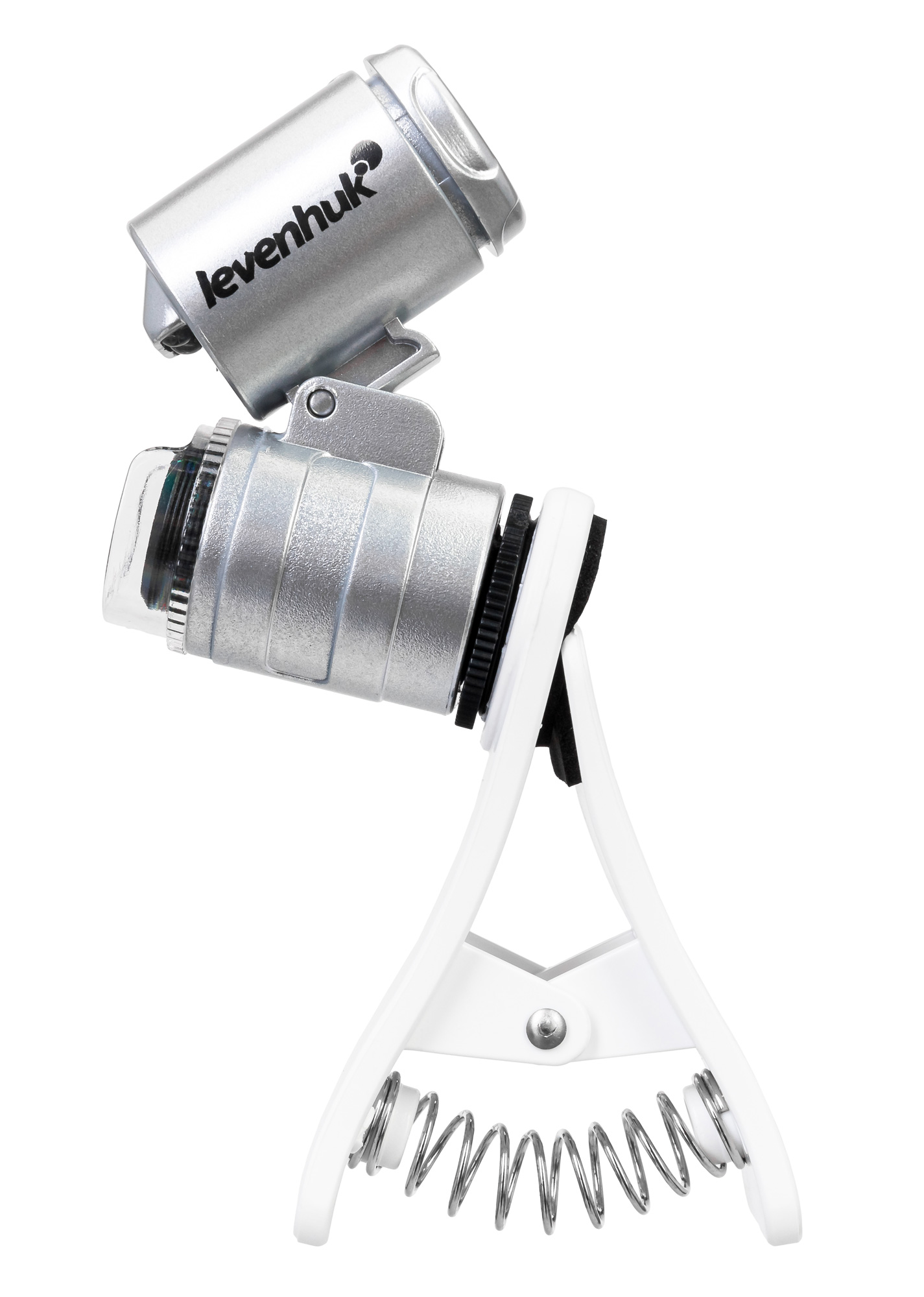 Этот микроскоп интересен еще и тем, что его можно использовать вместе со смартфоном. При помощи зажима он крепится к мобильному устройству, что позволяет использовать его камеру для фото- и видеосъемки. Кроме того, помимо ультрафиолетовой подсветки в микроскопе есть и обычные светодиоды, поэтому Levenhuk Zeno Cash ZC4 в один момент можно превратить в мощную лупу с 60-кратным увеличением.