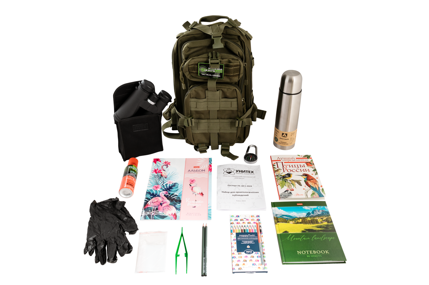 Набор предназначен для проведения практических занятий по биологии, зоологии (в частности, орнитологии) в школах и ВУЗах а также для любительского наблюдения за птицами (бёрдвотчинга). В состав набора входит 14 элементов.