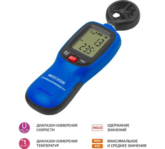 МЕГЕОН 11012 - это цифровой анемометр со встроенным термометром, предназначенный для быстрого определения параметров скорости потока воздуха с высокой точностью у вентиляций и на открытом пространстве.
