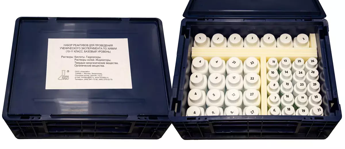Набор включает 31 готовых к использованию реактивов, в т.ч. (3 кислоты, 2 гидроксида, 11 солей, 2 индикатора, раствор аммиака), а так же органические и неорганические вещества, которые используются в лабораторной практикуме по химии на базовом уровне в 10-11 классах.