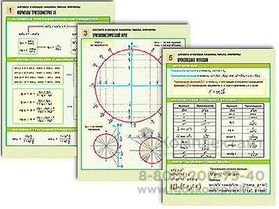 Пособие состоит из 6 полноцветных таблиц, ламинированных глянцевой пленкой: 1. Формулы тригонометрии (1). 2. Формулы тригонометрии (2). 3. Тригонометрический круг. 4. Логарифмы. 5. Производная функции. 6. Первообразная функции.