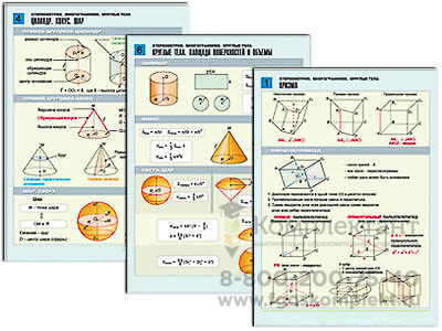 Пособие состоит из 6 полноцветных таблиц, ламинированных глянцевой пленкой: 1. Призма. 2. Пирамида. 3. Правильная пирамида. 4. Цилиндр. Конус. Шар. 5. Многогранники. Площади поверхностей и объемы. 6. Круглые тела. Площади поверхностей и объемы.