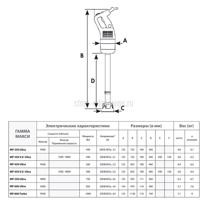 Скорость регулируется автоматически в зависимости от густоты приготовляемого блюда. Регулятор скорости находится на рукоятке и легко регулируется одной рукой. А при использовании специальных креплений для емкостей дает возможность автономной работы аппарата. MP 550 Ultra имеет мощный двигатель, что дает хорошую производительность и однородность готовой продукции без комочков. Удобная ручка с кнопкой ровной регулировкой скорости для легкой работы. Все детали, контактирующие с продуктами питания изготовлены из нержавеющей стали, что обеспечивает гигиену и долгую работу прибора на кухне вашего заведения.