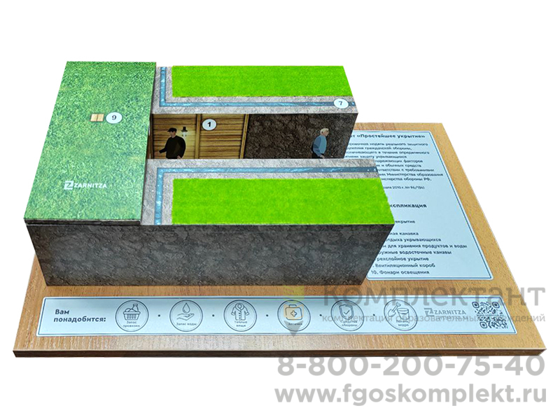 3D-макет "Простейшее укрытие" представляет собой масштабную планировочную модель реального защитного сооружения гражданской обороны, обеспечивающее в течение определенного времени защиту укрываемых от воздействия поражающих факторов ядерного оружия и прочих средств поражения в соответствии с требованиями и рекомендациям Министерства образования и науки РФ и Министерства обороны РФ (приказ от 24 февраля 2010 г. № 96/134), изготовленный с соблюдением всех объективных размеров и пропорций.