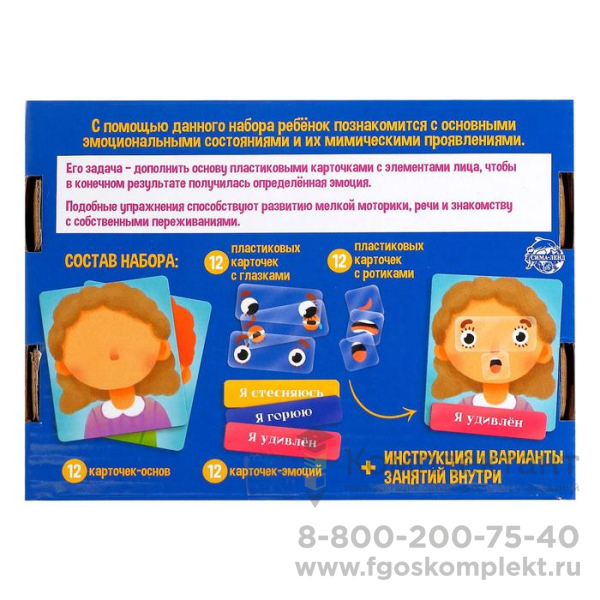 В наборе: 12 карточек-основ, 12 карточек-эмоций, инструкция и варианты заданий.