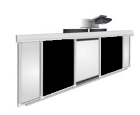 Слева и справа от интерактивной доски стационарно в стену крепятся две аудиторные доски. Еще две аудиторные доски крепятся в направляющий верхний профиль через систему кареток и имеют свободный ход. При необходимости преподаватель может закрыть интерактивную доску сдвинув их к центру либо раздвинуть их и работать на интерактивной доске.